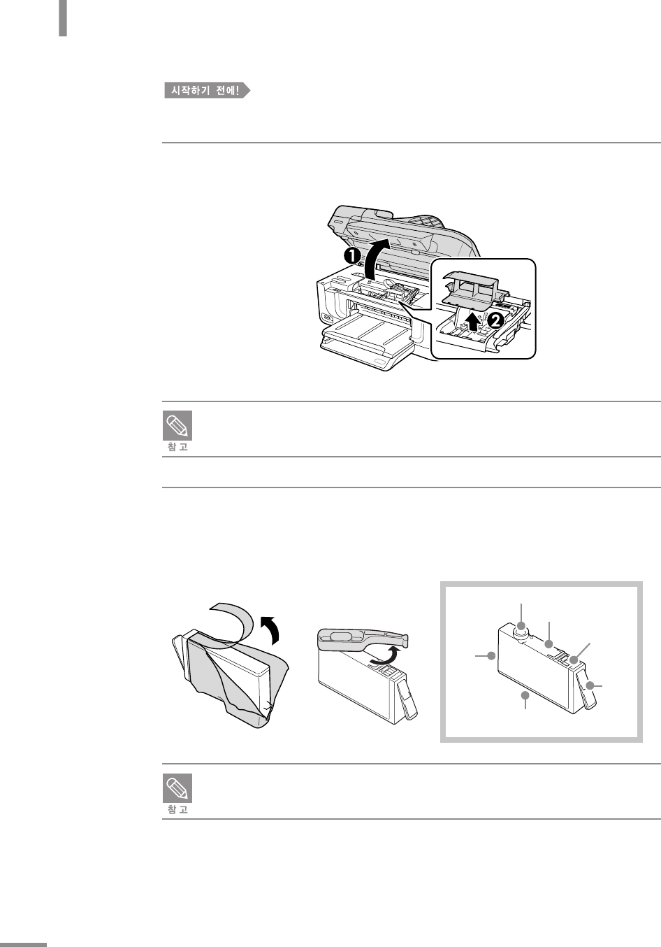 잉크 카트리지 삽입구 덮개를 열면 잉크 카트리지함이 복합기의 가운데로 이동합니다 .